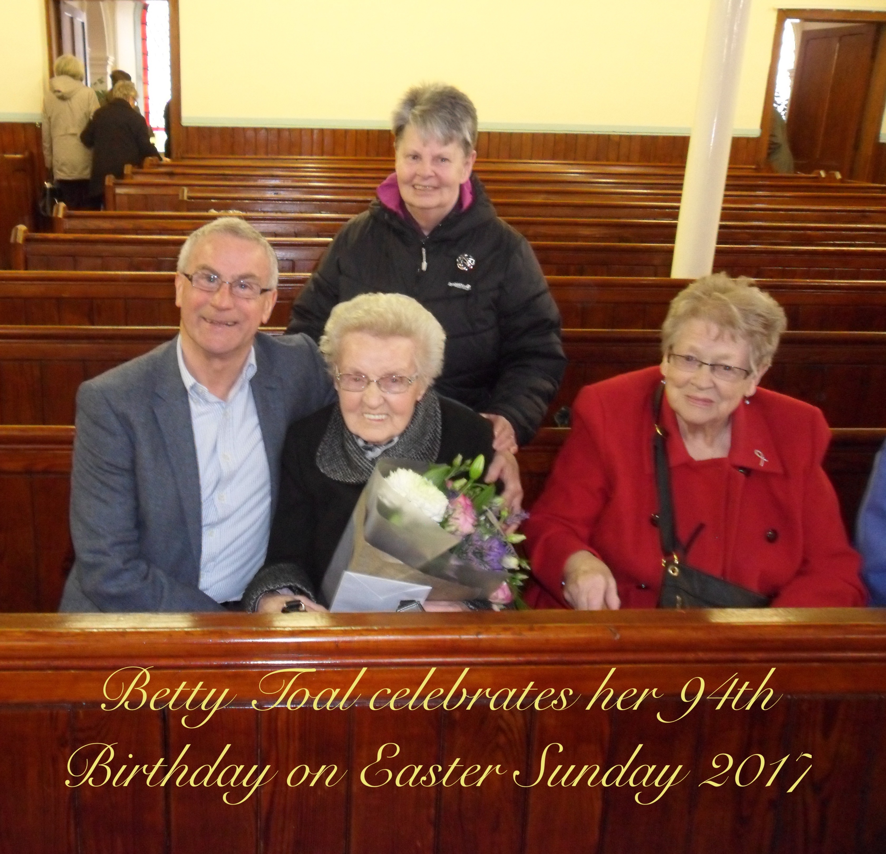 Happy birthday Betty Toal April 16, 2017 by Alan Mathew, posted in Weekly Church News Everyone wishes Betty a very happy birthday. Stan Cook, session clerk, is pictured with Betty (centre) with friends Liz and Rena.