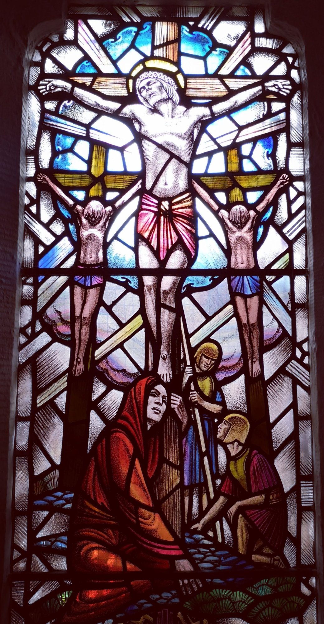 The right hand side of the window is dedicated to the crucifixion where Jesus can be seen with a criminal on either side. The crown of thorns is visible and some nails are also in the picture.