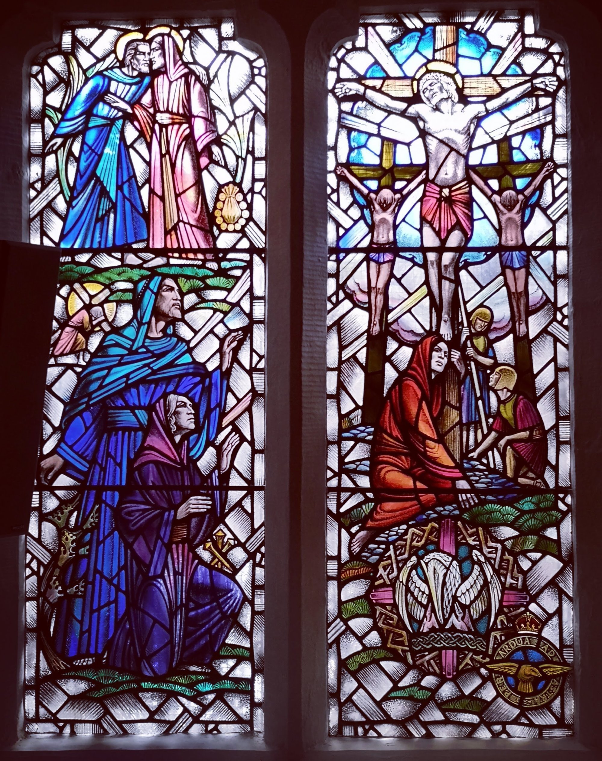 The right hand side of the window is dedicated to the crucifixion where Jesus can be seen with a criminal on either side. The crown of thorns is visible and some nails are also in the picture.
