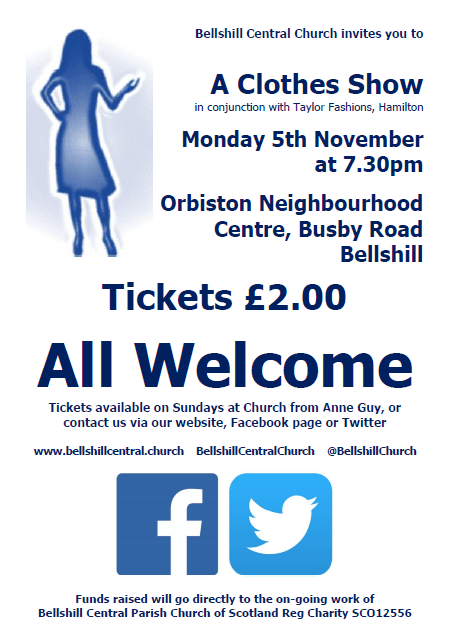Anne Guy has organised another Clothes Show being held this Monday, 5th November, in the Orbiston Neighbourhood Centre. Tickets are just £2.00 (a real steal!) and are available from Anne Guy or Cathie Bryden. The show is in partnership with Taylor Fashions of Hamilton. The show starts at 7.30pm and all are invited. All funds raised go towards the work and witness of Bellshill Central Parish.