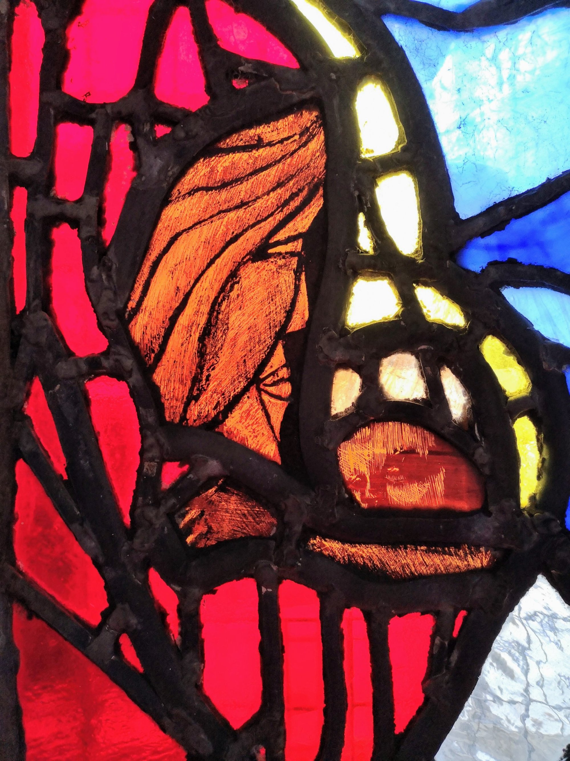 It is found in the east (or left) stair in the vestibule as you enter the Church, and is one of three lancet windows in the east stairwell. A lancet window is described as a slender pointed arched window. Read more here