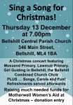 - Thursday 13th – Sing a Song for Christmas (date confirmed) in aid of women’s aid at 7.00pm