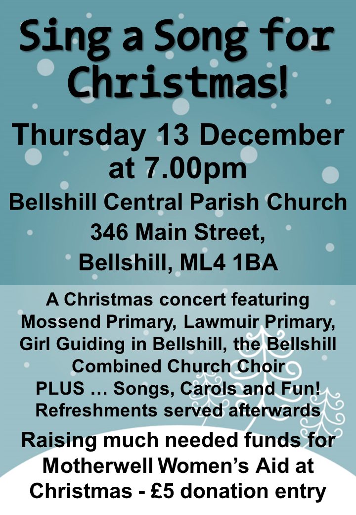 Sing a Song for Christmas! returns for 2018 at Bellshill Central Parish Church. Featuring Mossend Primary School and Lawmuir Primary School in Bellshill. We are raising funds for Motherwell & District Women’s Aid.