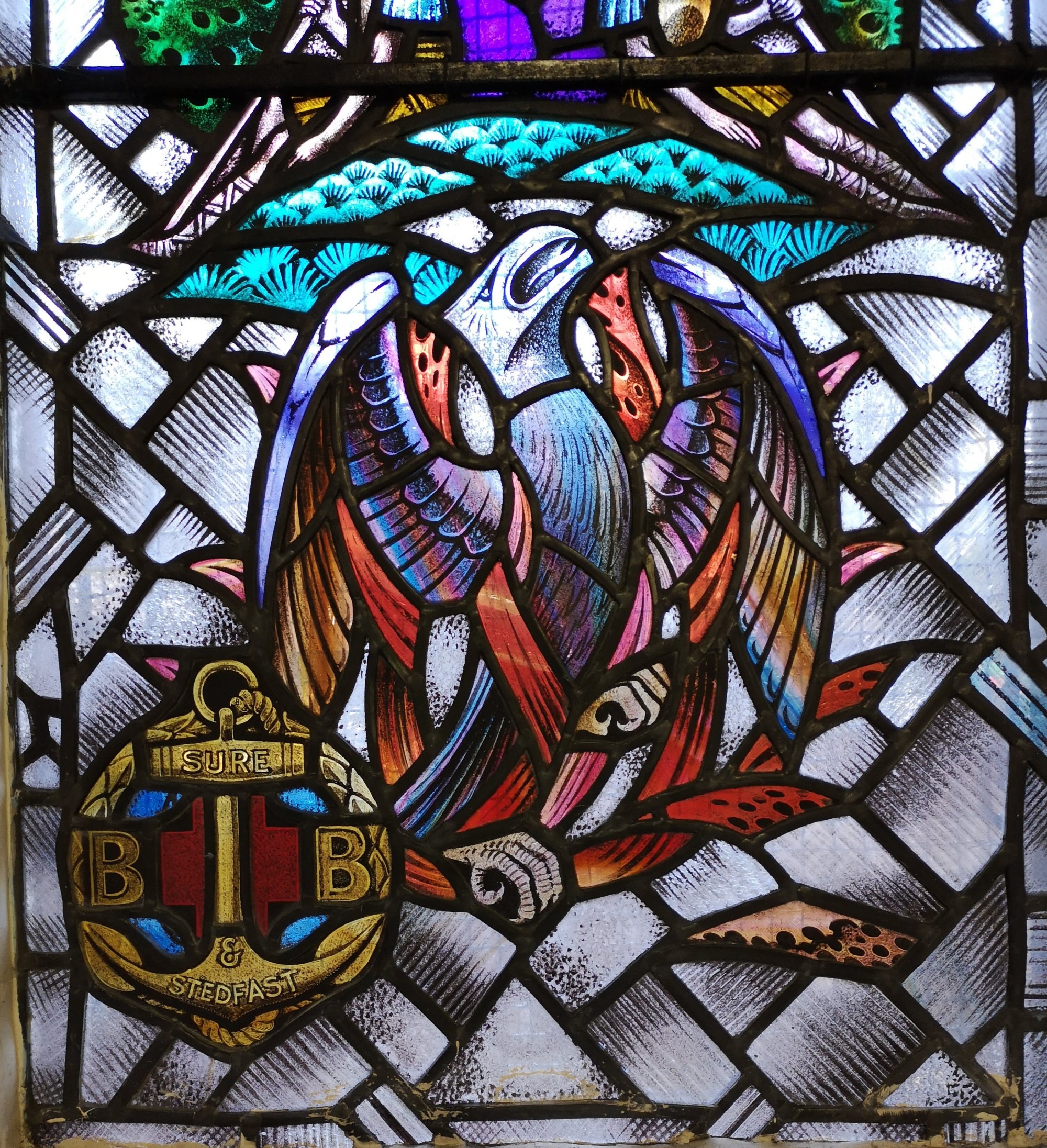 At the bottom of the left hand pane of the window the Boys Brigade logo can be seen. It seems likely, therefore, that James was an active member of the BB before his untimely death. The BB Company of the former Macdonald Memorial Church was the 2nd Bellshill Company. Above that, a peacock can be seen with its resplendent plumage.