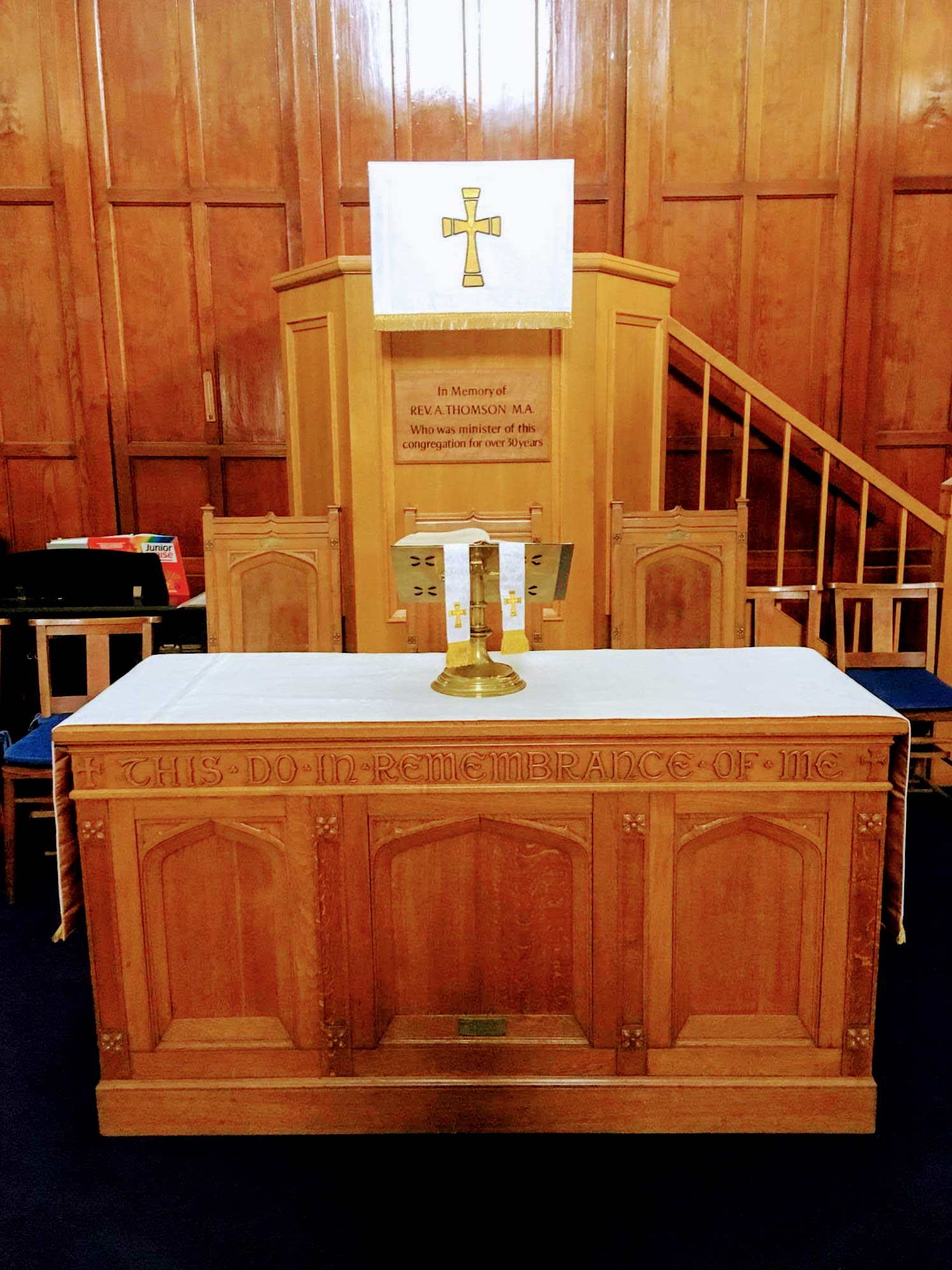 Finally, located centrally within the choir box is the communion table. Inscribed upon it is the “This do this in remembrance of me” found at Luke 22:19. These words were spoken by Jesus himself at the last supper.