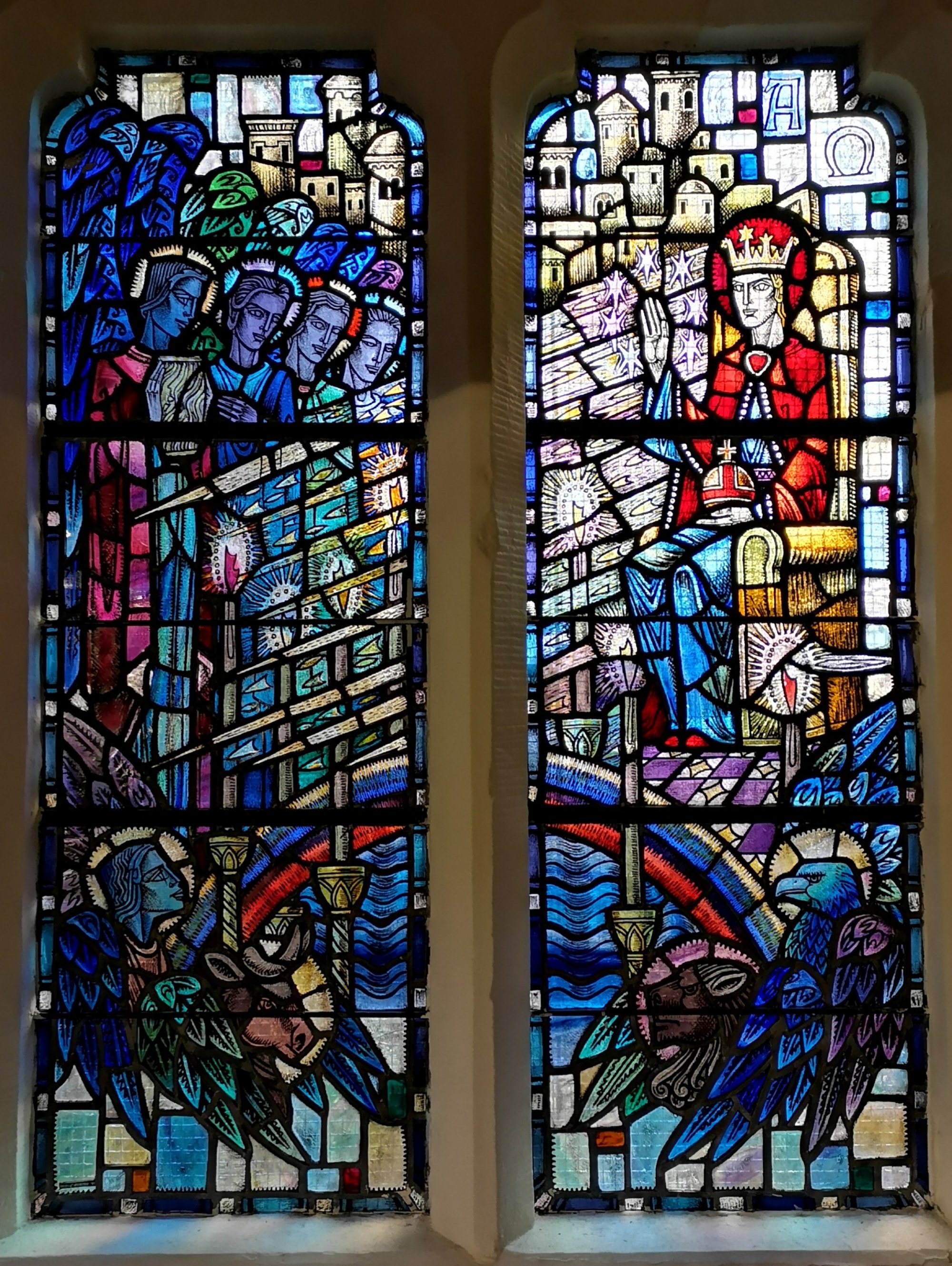 This window is quite complex and takes its theme from the Book of Revelations (page 313 onward in the New Testament section of the Pew Bible). The themes depicted are repeated in various forms throughout Revelations and it is worth spending some time reading the book for yourself.