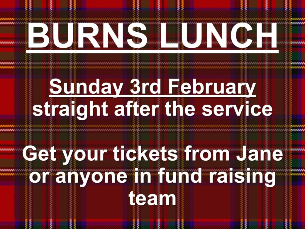 On Sunday 3rd February (please note revised date) straight after the morning service we hold our annual burns Lunch. Tickets on sale and are available from Jane Aitken, Lesley Marshall and all other members of the Fund Raising Group. The Haggis, Neeps and Tatties are ordered and the Scots songs are looked out for a jolly old sing song. The Address to the Haggis is being prepared, all we need are the mouths to feed. An event not to be missed! Email the church bellshillcentral@gmail.com or message via the Facebook page to reserve tickets.
