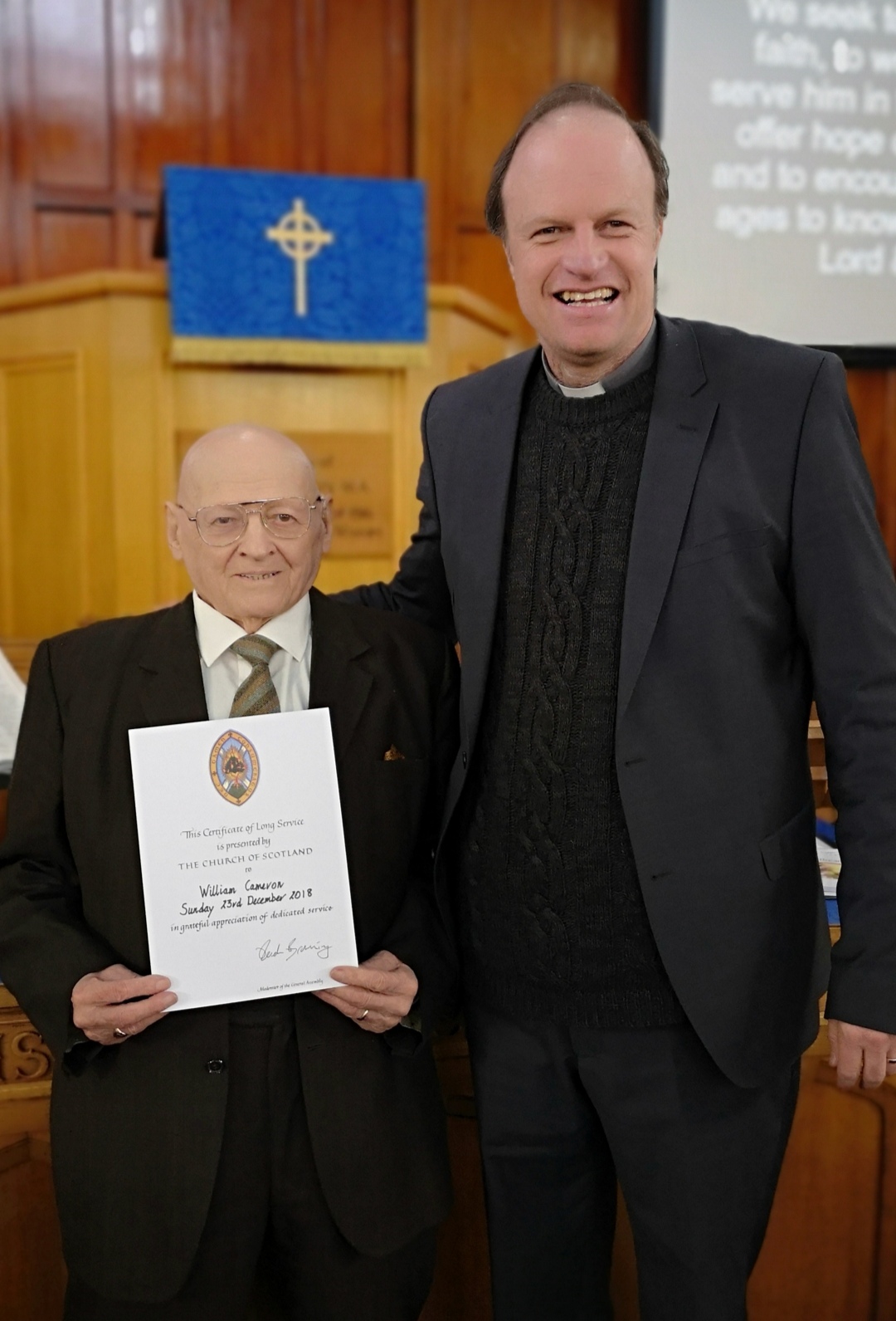 Mr William (Bill) Cameron received a long service certificate presented by the Minsiter, Rev Kevin de Beer, and signed by the moderator of the Church of Scotland in recognition of 30yrs plus as an Elder in the Church of Scotland. Bill first served in Macdonald Memorial Church in Bellshill, Holytown Parish Church and now Bellshill Central Parish Church. Bill is pictured with Rev de Beer with his certificate.