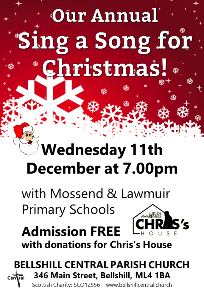 This is a charity fund raising night for CHRIS’S HOUSE – a worthy local charity. We look forward to hearing and singing with the kids from Lawmuir and Mossend Primary Schools. The Church choir will sing some songs from our Christmas Musical.