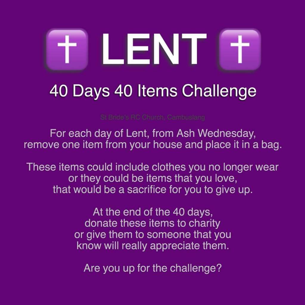 #40DAYS40ITEMS February 23, 2020 by Bellshill Central, posted in Other News, Prayer items 40DAYS40ITEMS – Instead of giving up something for Lent this year, why not try the 40 days – 40 items challenge? Please share with family and friends. Lent begins on 26th February 2020.