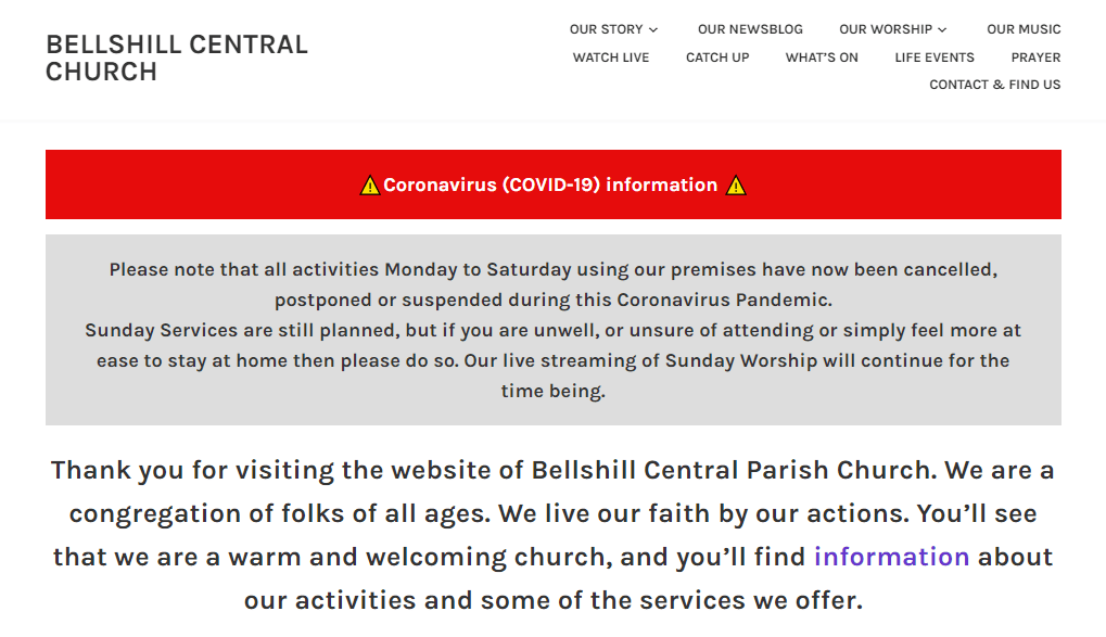 If you are in need of any info about the activities in our Church please visit our website www.bellshillcentral.church where you will be kept updated. You can also find info at our Facebook and Twitter feeds. During this time we will continue to pray for people (please use the Prayer link on the website) and stream worship where we can. Please get in touch with us if you are in need of anything that we might be able to help with.