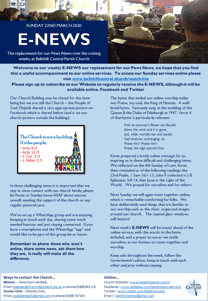 Weekly E-NEWS from BCPC March 22, 2020March 22, 2020 by Bellshill Central, posted in Weekly Church News click to download