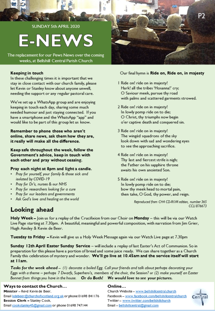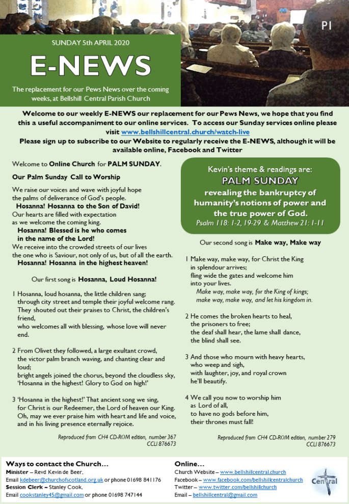 Watch “Online Worship – Palm Sunday 5th April 2020 from Bellshill Central Parish Church” on YouTube April 6, 2020April 6, 2020 by Alan Mathew, posted in Catch Up