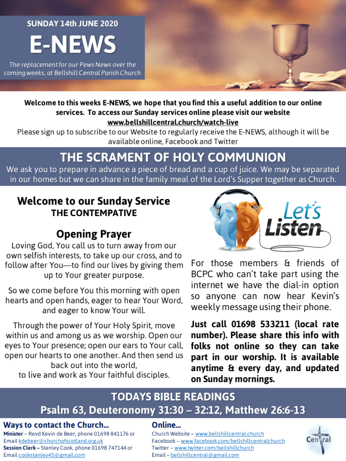 Hello there! It’s Saturday which means only one thing, that its time for the latest ENEWS from Bellshill Central Parish Church with some useful information for our Sunday Service, on 14th June 2020.