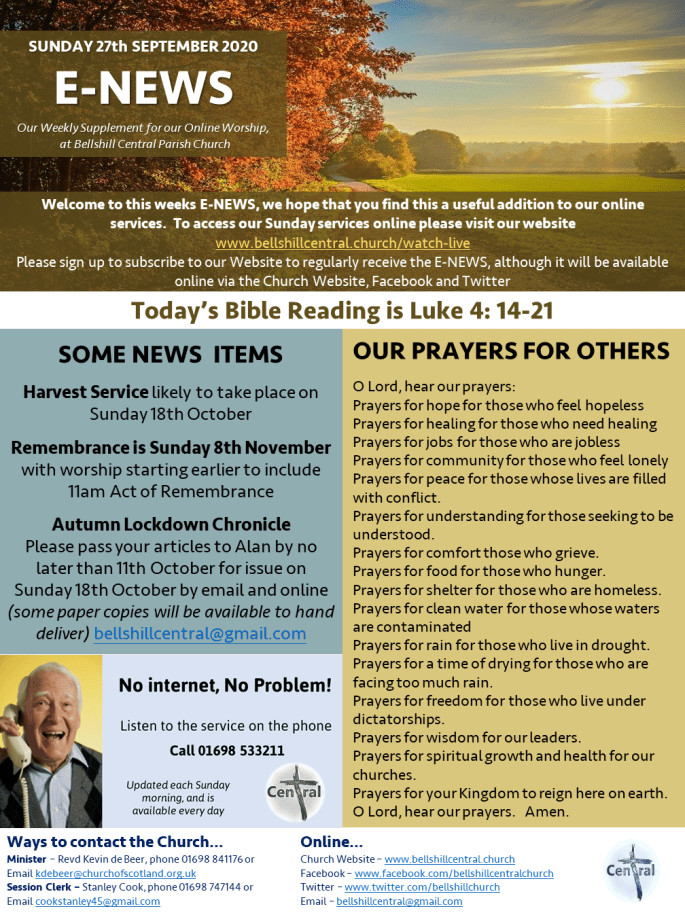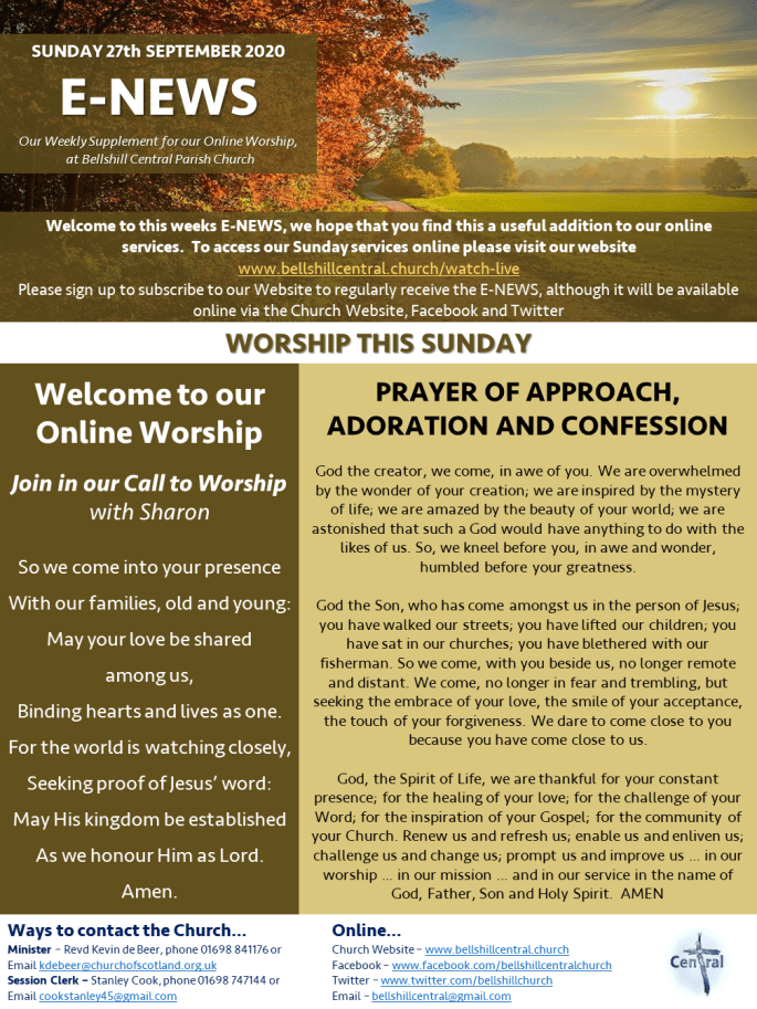 Hello, welcome to Bellshill Central Parish Church Sunday Worship for 27th September 2020 with Rev Kevin de Beer and Members of our Church Family.