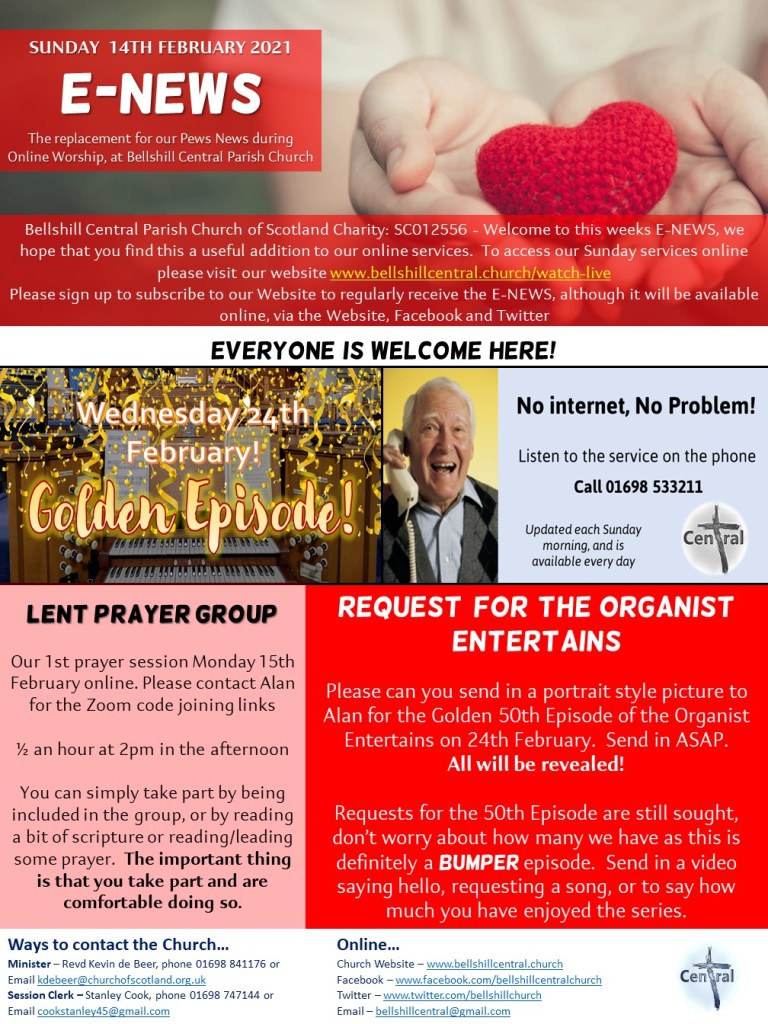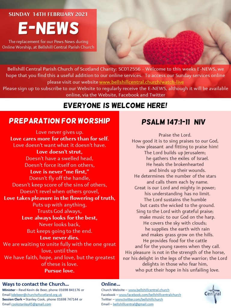 Please see attached our weekly ENEWS for Sunday 14th February – enjoy reading the news and there are some items to prepare you for our worship.