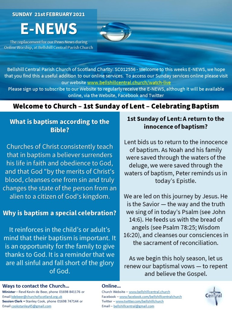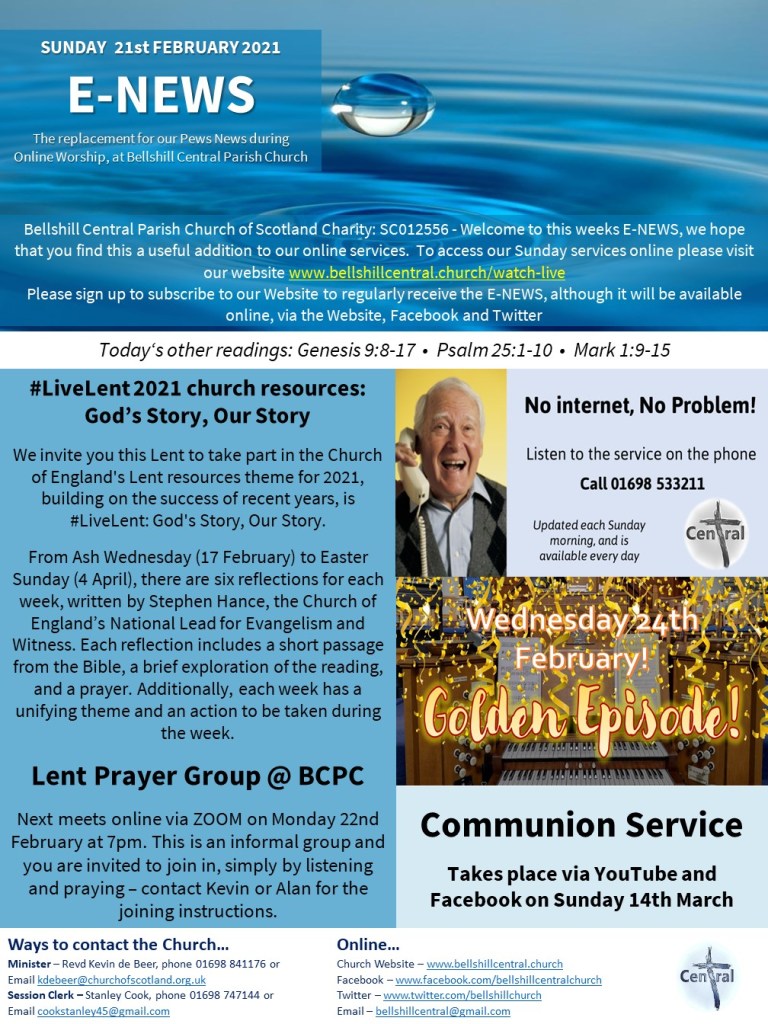 Attached for your information is this weekends ENEWS. Remember also that the service is available by dialling 01698 533211. It is updated each Sunday morning and is then available for the rest of the week. If you know someone who cant access the service online this is a great way for them to worship.