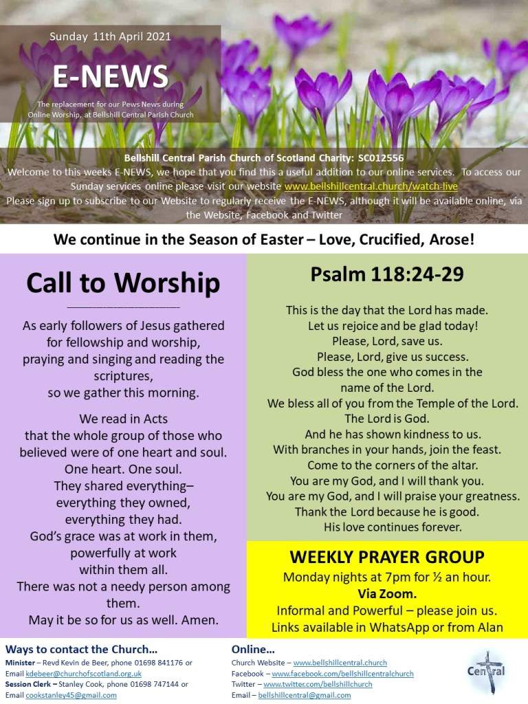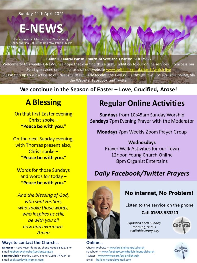 Attached for your information is this weekends ENEWS. Remember also that the service is available by dialling 01698 533211. It is updated each Sunday morning and is then available for the rest of the week. If you know someone who cant access the service online this is a great way for them to worship.