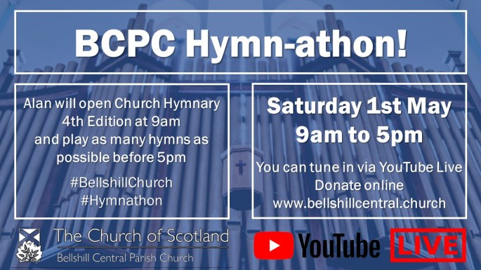 LOCKDOWN FUNDRAISING – An organ marathon takes place this Saturday, 1st May, from 9am to 5pm. Our organist, Alan Mathew, is attempting to play as many hymns as possible from Church Hymnary 4th Edition. You are invited to sponsor Alan, make a donation or “buy” a particular hymn. Find our more at www.bellshillcentral.church/hynnathon-2021