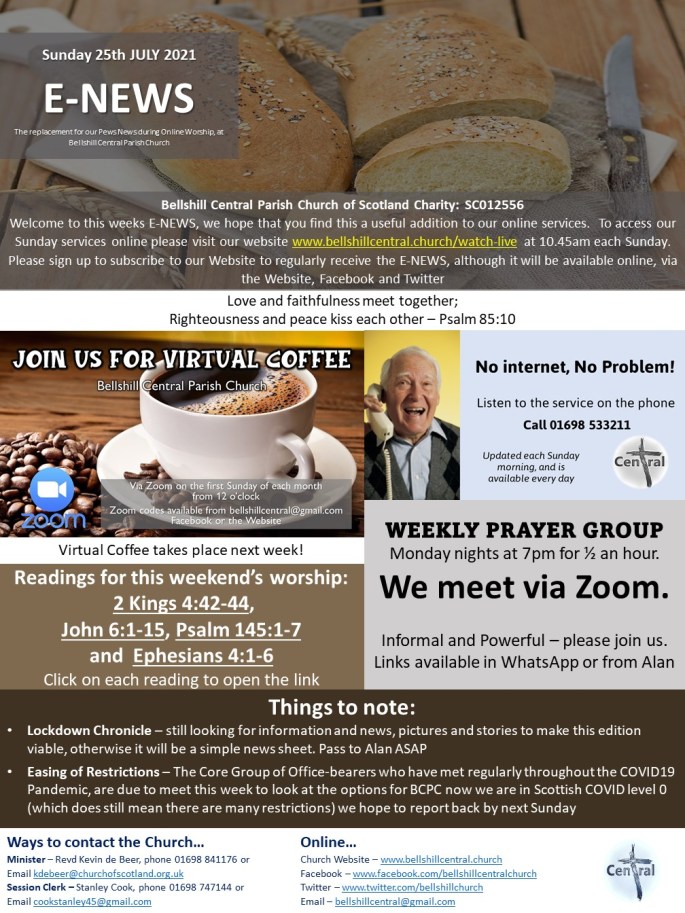 Our Minister, Rev Kevin de Beer leads us in Worship, with readings and prayers from members of our Faith community. The service is available via 01698 533211 for those not able to get online. Please share with those who might benefit.