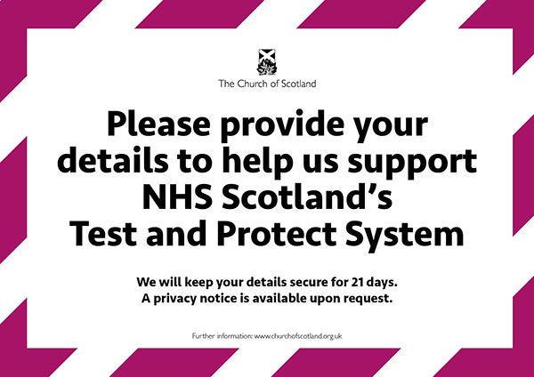 Wearing facemasks in church is mandatory, unless you are exempt under the Scottish Government guidance. You MUST remain at least 1 metre physically distanced from each other unless you are part of a household group or bubble. You must sanitise your hands on entry and exit. We will take your details for NHS test and Protect.