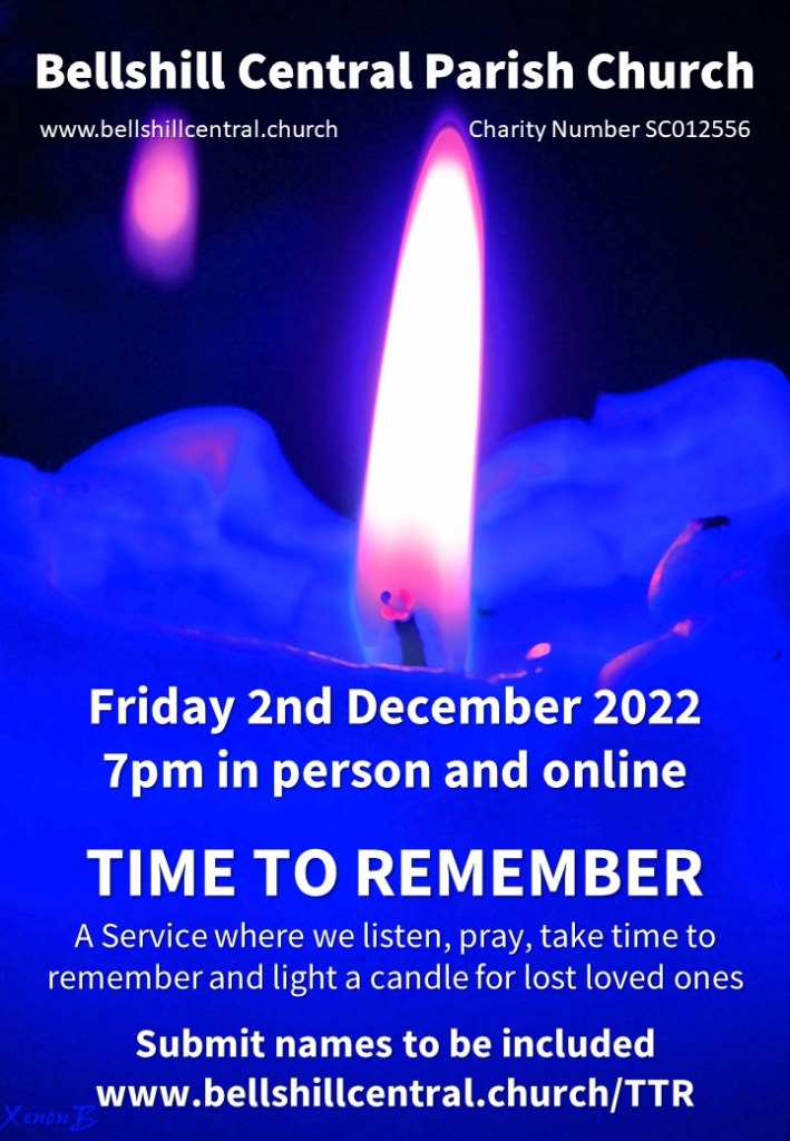 We wanted to let you all know about our Time to remember (or Blue Christmas) service on Friday 2nd December at 7pm in Bellshill Central Parish Church. The service is in conjunction with Potts Funeral Directors and is ecumenical with partners from both Church of Scotland and our Roman Catholic Church friends in Bellshill.