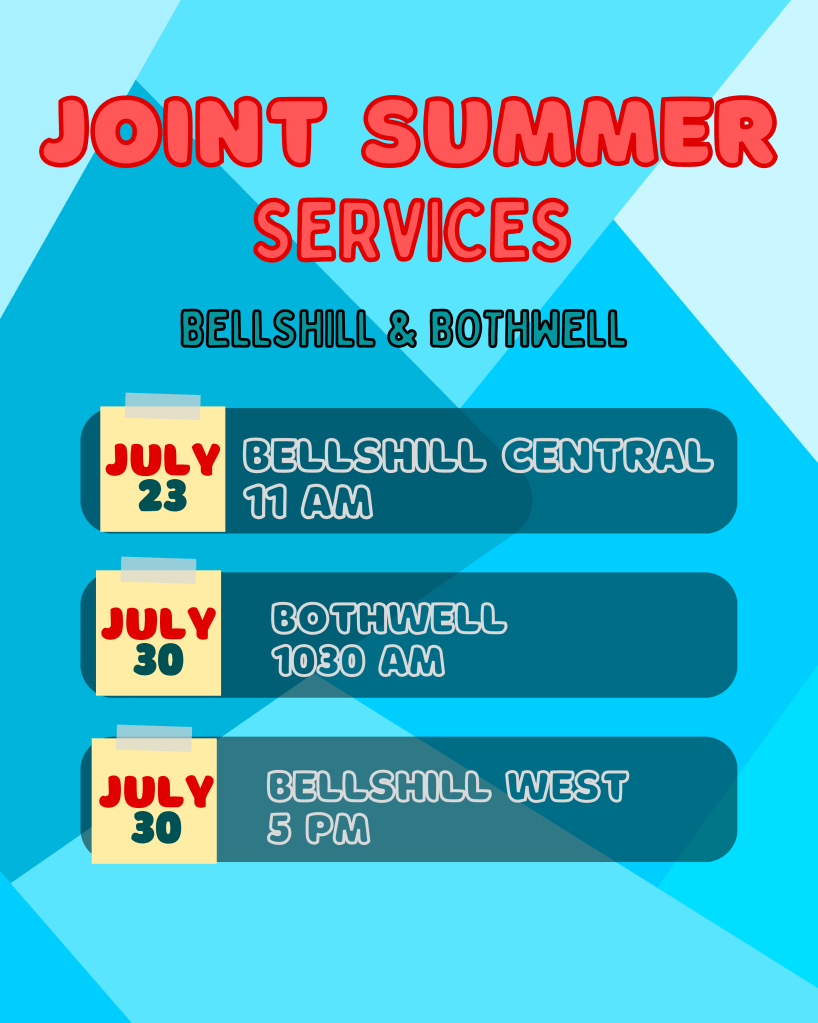 Join us for the 4th joint summer service as we head back to Bellshill Central Parish Church for Sunday 23rd July at 11am. Activities for children are available with tea, coffee and a chance to meet one another afterwards. Parking is once again available on Bruce Street; the health centre car park and Fosters Funeral Directors is available.
