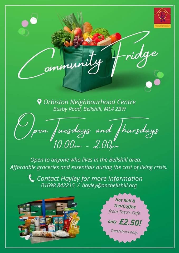 We particularly support in practical terms the Community Fridge Initiative at Orbiston Neighbourhood Centre. We collect non-perishable food stuffs, toiletries, and cleaning products that are taken to be used for the people of our town