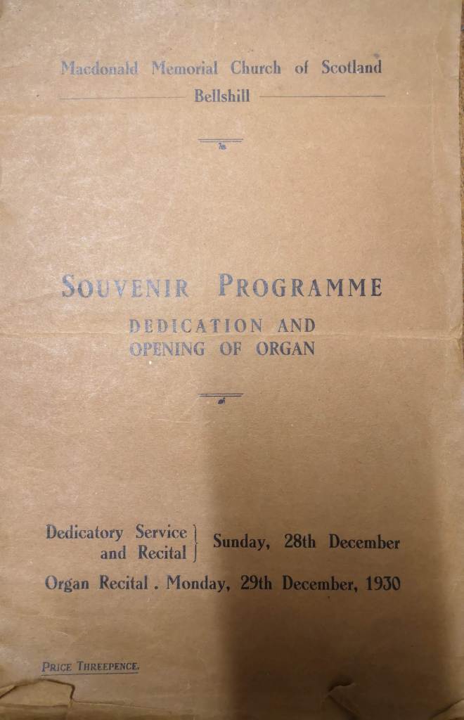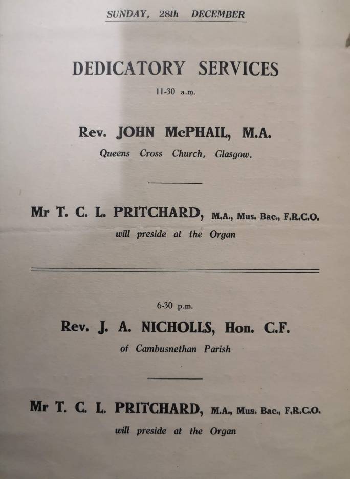 The organ is designed and built by the Hilsdon Organ Company, and installed in December 1930 with the Dedication Service and Recital on Sunday 28th December of that year, followed by an evening recital on Monday 29th December. The organist who performed at the opening services was Mr T.C.L. Pritchard (M.A., Mus. Bac, F.R.C.O) of Belhaven Church, Glasgow. Pritchard was a prominent organist at the time and performed regularly at the Glasgow Kelvingrove Organ. (As an aside, the organ he presided over at Belhaven Church was said to be particularly fine and “built at a cost of over £1,100 by Messrs. T. C. Lewis and Co., of London” — half as much again as the cost of the whole church)