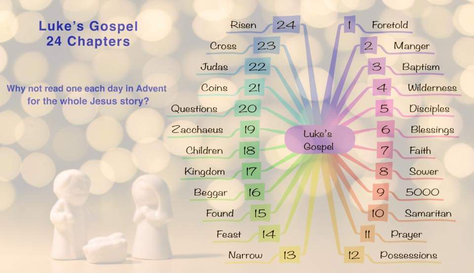 Beginning on 1st December (the 1st day of Advent) we challenge you to read just one chapter of the Book of Luke each day. There are 24 chapters. So, on Christmas Eve you will have read the entire account (or story) of Jesus’ life. You can then wake up on Christmas Day knowing just WHO we are celebrating and WHY.