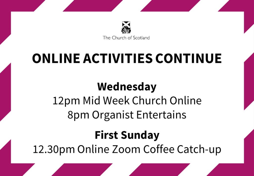 Wearing facemasks in church is mandatory, unless you are exempt under the Scottish Government guidance. You MUST remain at least 1 metre physically distanced from each other unless you are part of a household group or bubble. You must sanitise your hands on entry and exit. We will take your details for NHS test and Protect.