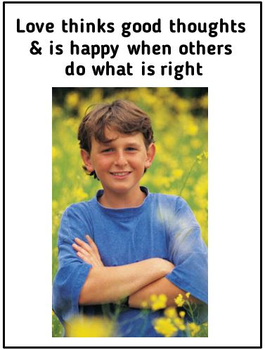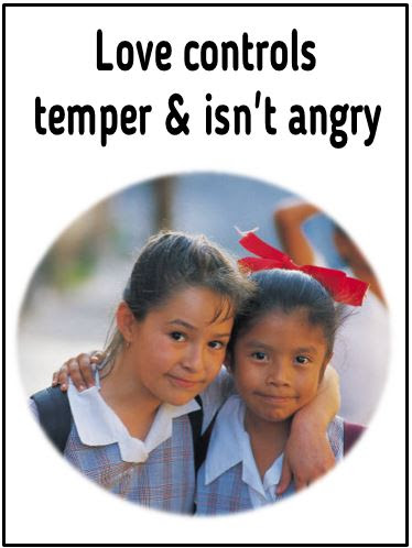6. Controls Temper: Love is not provoked. That means that Love doesn’t become angry easily. Love is forgiving. Take time to let your temper cool down. Don’t hold grudges.Love thinks no evil. Discuss anger and what angers the students and what they can do to control it.