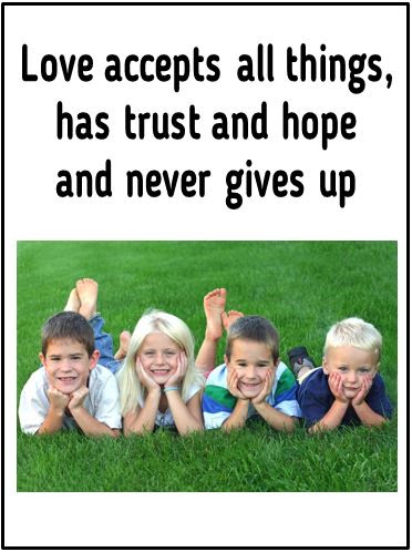 8. Love bears all things. (Love accepts and protects.)Love believes all things. (Love trusts)Love hopes all things. (Love always has hope.)Love never fails. (Love puts up with things and never gives up.) If you love someone or something, you never stop trying. Love is patient, willing to listen and take the time to pay attention. (vs. 7-8)