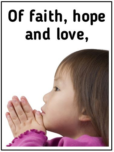 9. Look at today’s Bible verse 13. There’s faith, hope and love;Faith is believing in Jesus and knowing that He will do what’s best for us.Hope is knowing that we will be with Jesus in Heaven.And God is love! Love never ends. We have faith in what Jesus taught us, and we know that if we do everything He commands, we will go to Heaven with Him.