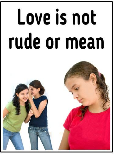 4. Not Rude or Mean: Love does not behave rudely. Love is not impolite or mean. Love doesn’t do things that we’ll regret or be ashamed of later. Discussbeing mean. (vs. 5)
