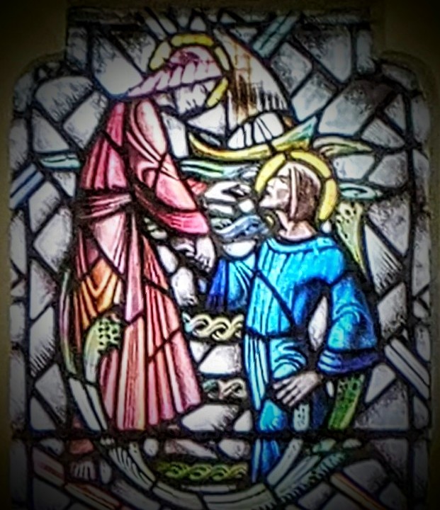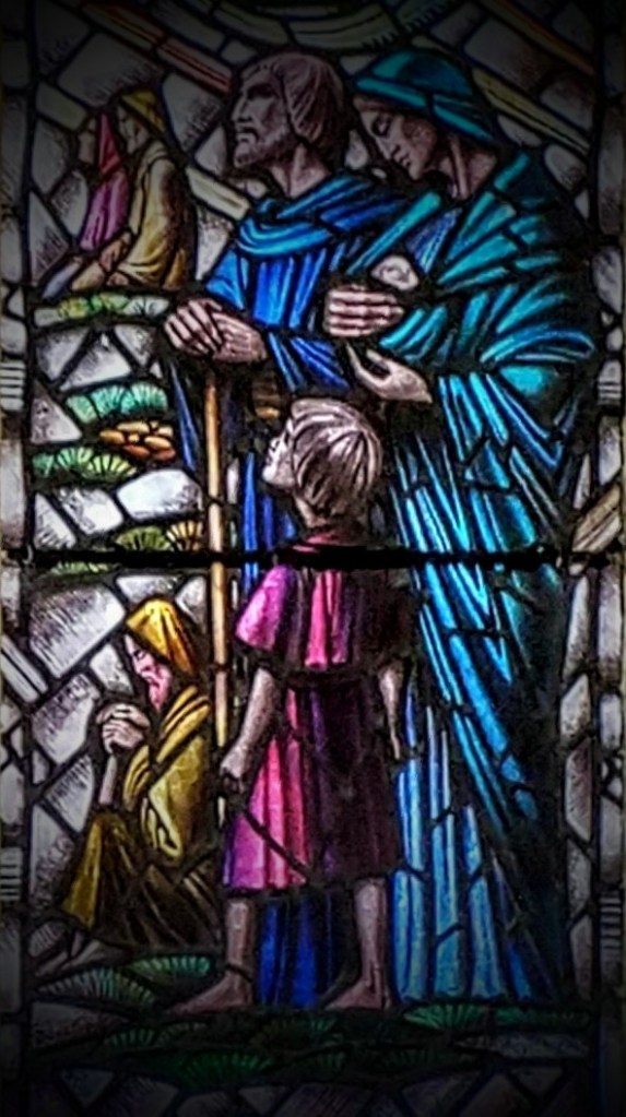 The story continues at the top of the right side of the window where a boat can be seen with Christ walking on the water and taking Peter’s hand when he starts to sink. See Matthew 14, verse 22-32 (page 22 of the Pew Bible):
