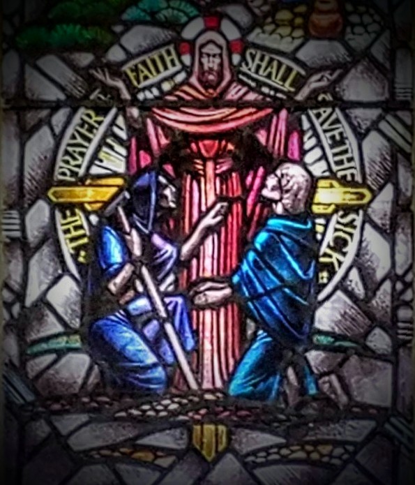 Below that, Jesus can again be seen; this time with his arms raised. Two men are at his feet, one with a walking stick and the other with his eyes closed; perhaps blind. The words around this picture say, ‘The prayer, faith, shall save the sick,’ which is a reference to James 5; 15 where it says, ‘And the prayer of faith shall save the sick, and the Lord shall raise him up.’