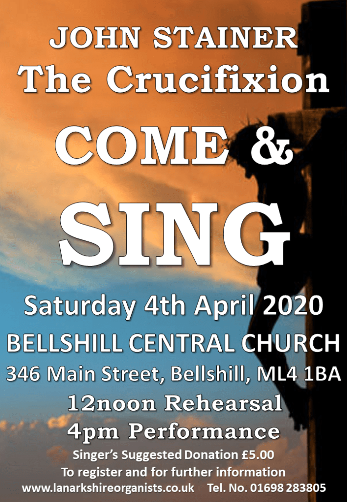 - Saturday 4th April – Come and Sing Stainer’s Crucifixion, organised by the Lanarkshire Organists (12pm rehearsal, 4pm performance)