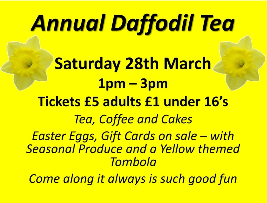 - Saturday 28th March – Daffodil Tea 1pm to 3pm and tickets on sale very soon, also pay at the door. Easter gifts, cards, yellow themed tombola and lovely home baking and goodies.